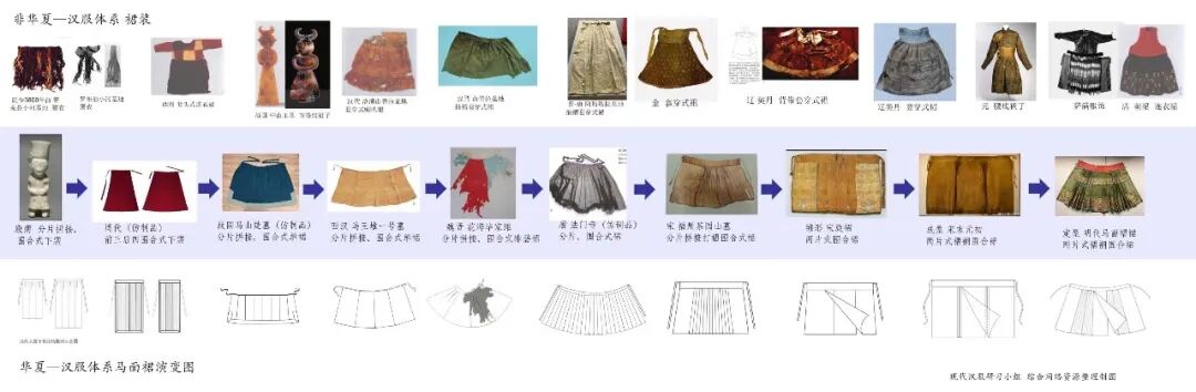 旋裙以及后來的馬面裙,從結構上,與遼金契丹等胡服是兩條發展線索,馬面裙來源是中國傳統裙子樣式,并不起源于胡服。