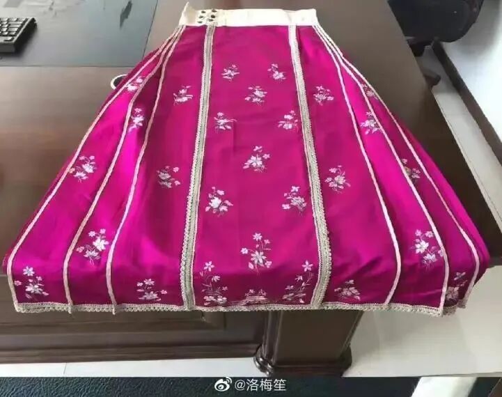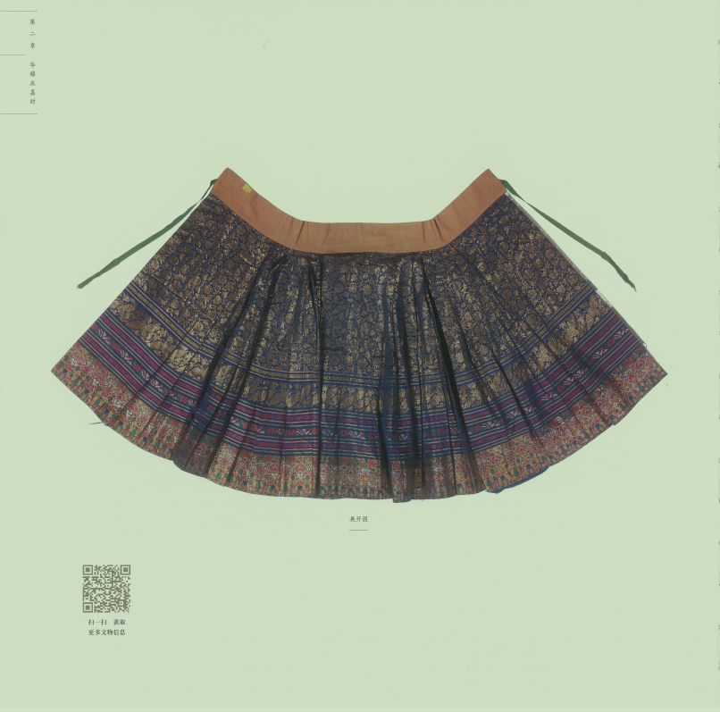 1980年明嘉靖徐蕃夫婦墓出土。腰用雙層白棉布做成,兩端縫布帶系結,帶長50厘米。裙身左右各打6道褶,正中開衩,用朵梅紋花緞制成。