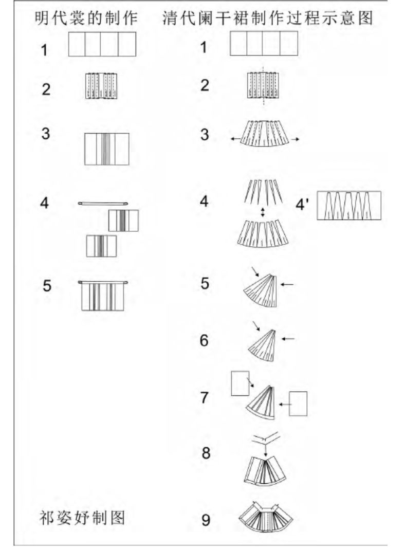 明代馬面裙只在裙身與裙腰相接處將褶份縫合,裙身其余部分褶裥熨燙定型即可。清代的魚鱗裙除了與裙腰處將褶份縫合外,每個褶子與相鄰褶子還要縫合,使褶子與褶子之間呈菱形網格狀,形成類似魚鱗的造型。