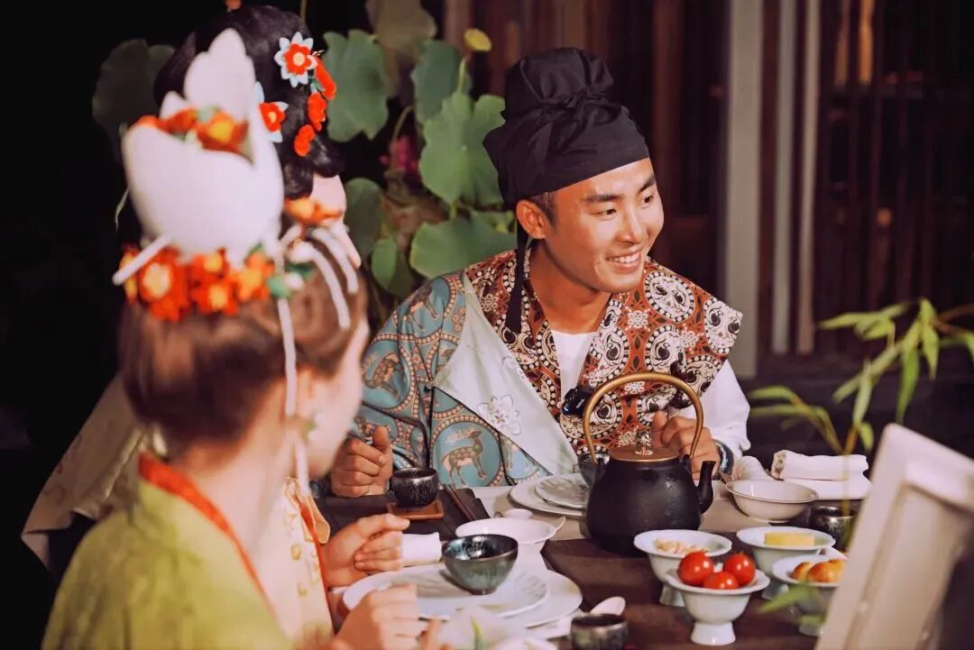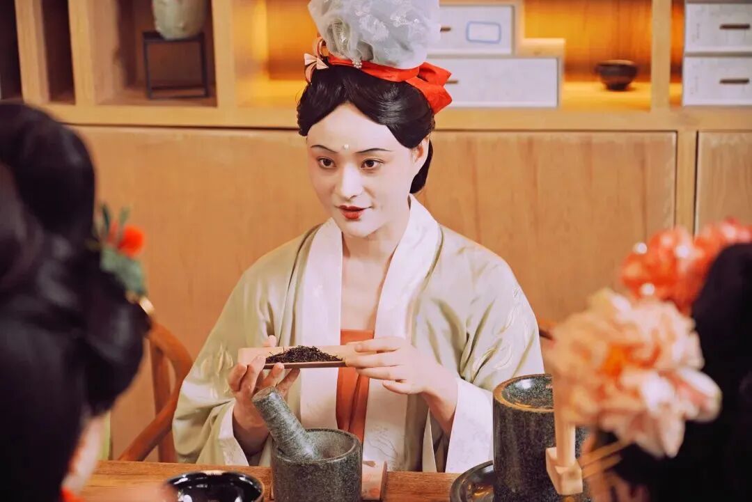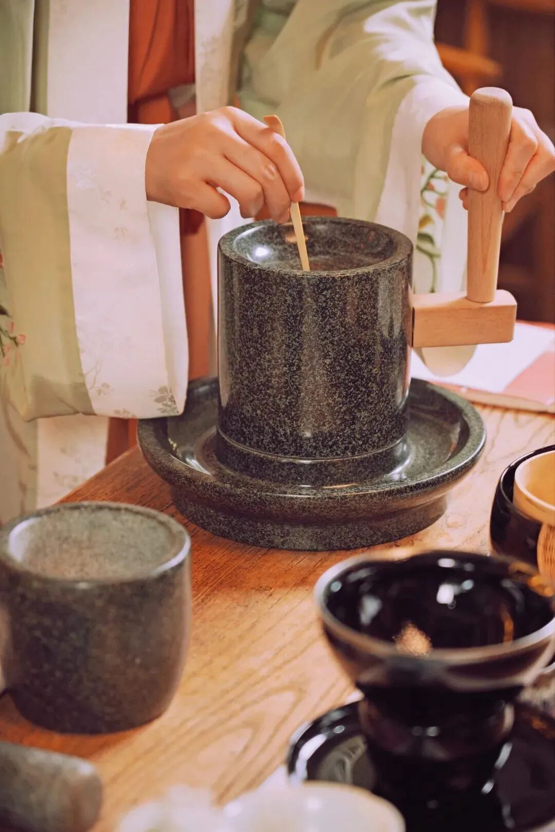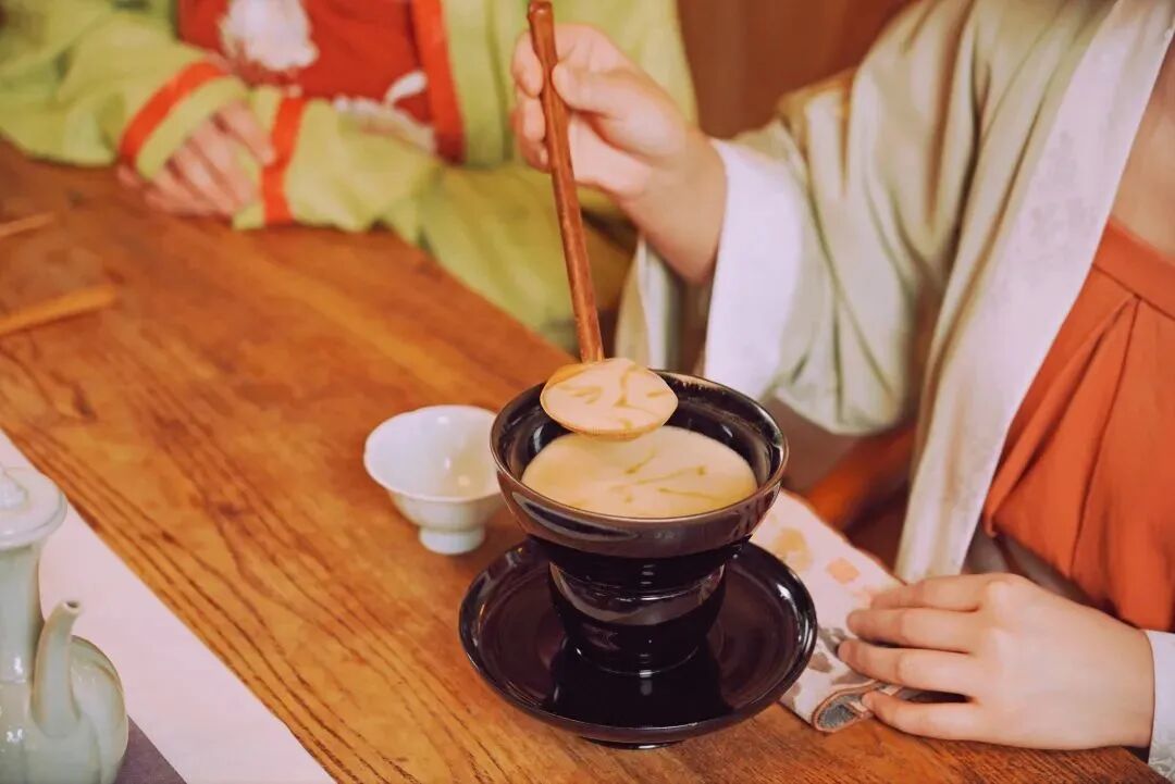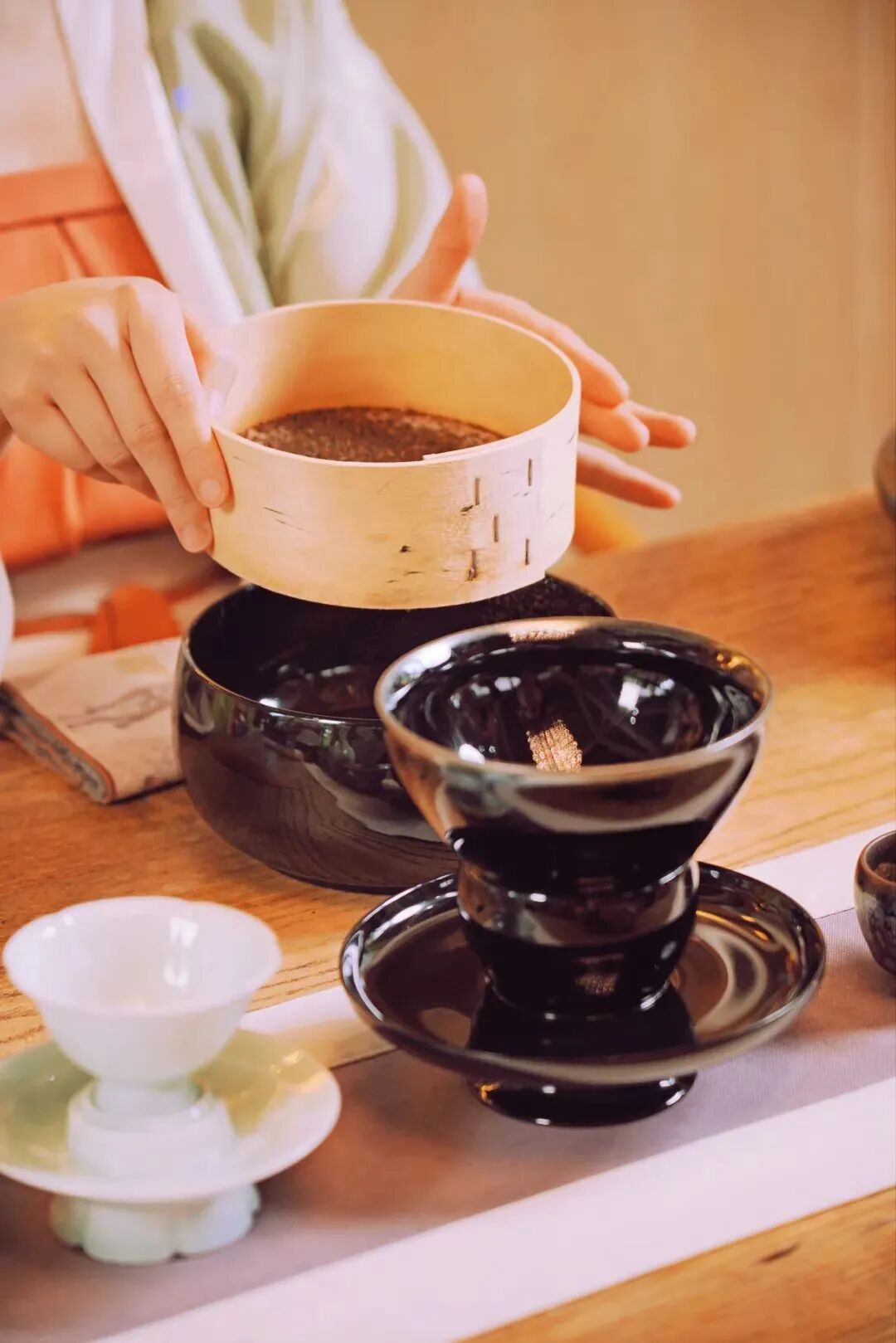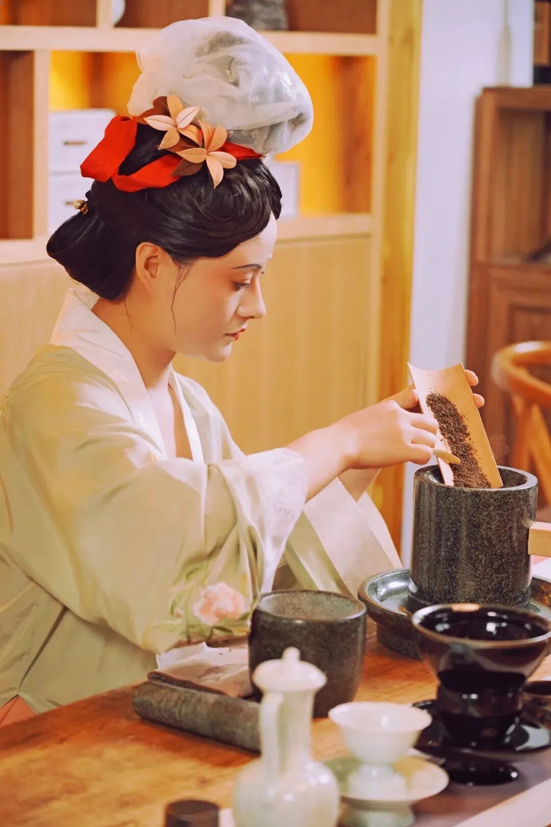 【點茶】是中國古代茶藝的代表之一,宋代點茶法是將茶葉末放在茶碗里,注入少量沸水調成糊狀,然后再注入沸水,同時用茶筅(調茶工具)攪動,茶末上浮動,形成粥面。點茶文化后傳入日本,衍生為日本的點茶道。