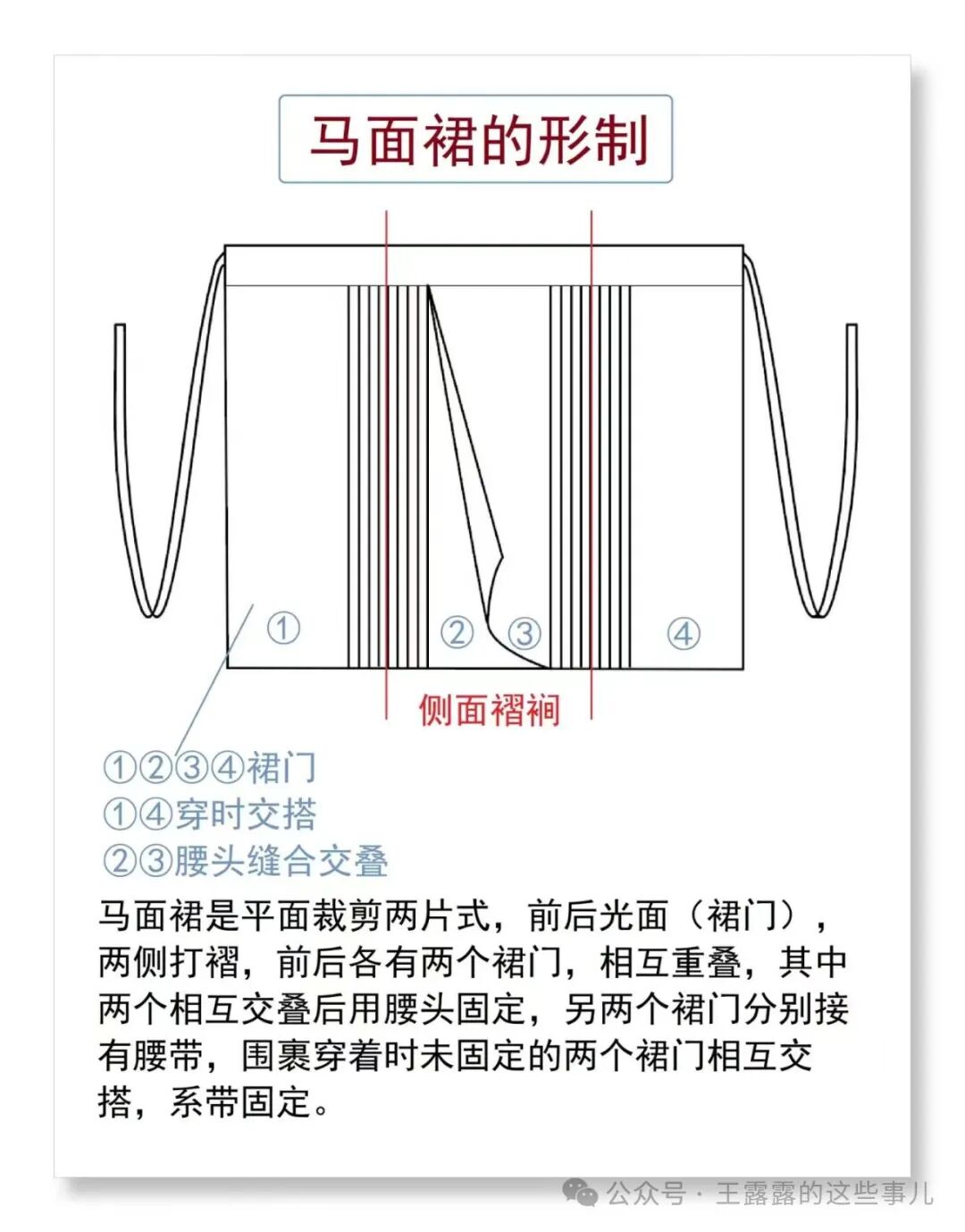 又名馬面褶裙,中國古代女子主要裙式之一。馬面并非馬的面部,而是原指古代一種塔樓式的建筑。馬面裙前后共有四個裙門,兩兩重合,側面打裥,中間裙門重合而成的光面形似古城墻上凸出的墩臺便稱其為馬面。