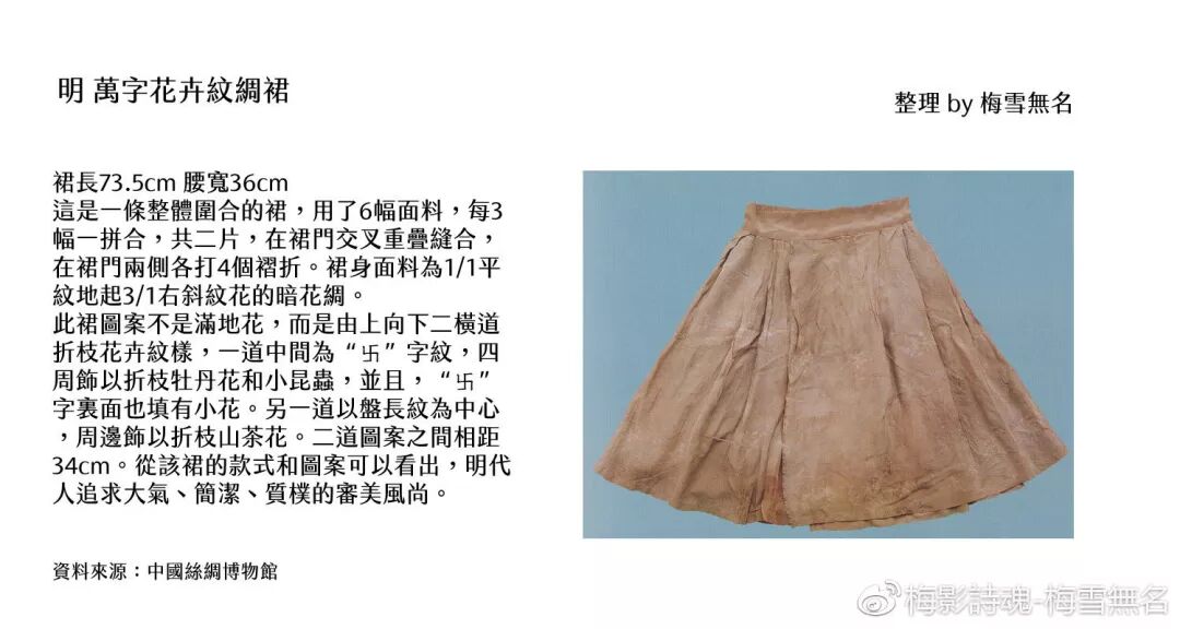 因為明代女裙,馬面裙占了絕大多數,因此不需要刻意描述形制。到了服飾史中,為了區別這種有馬面構造的裙子,而將之稱為馬面裙。