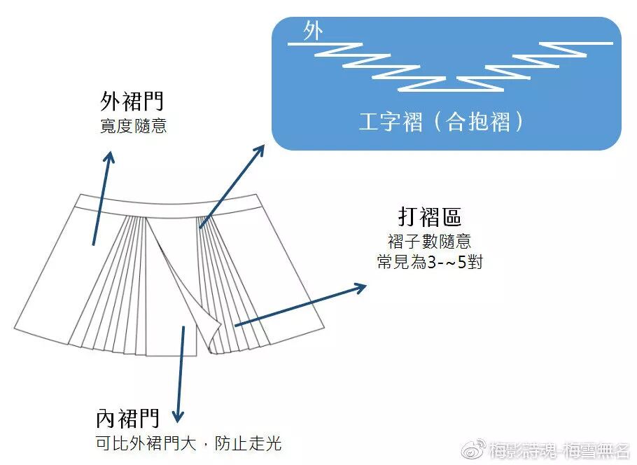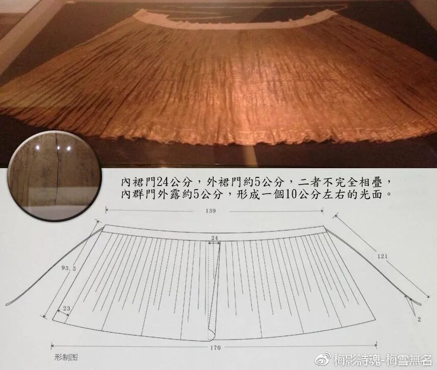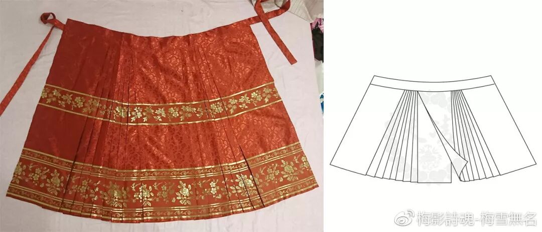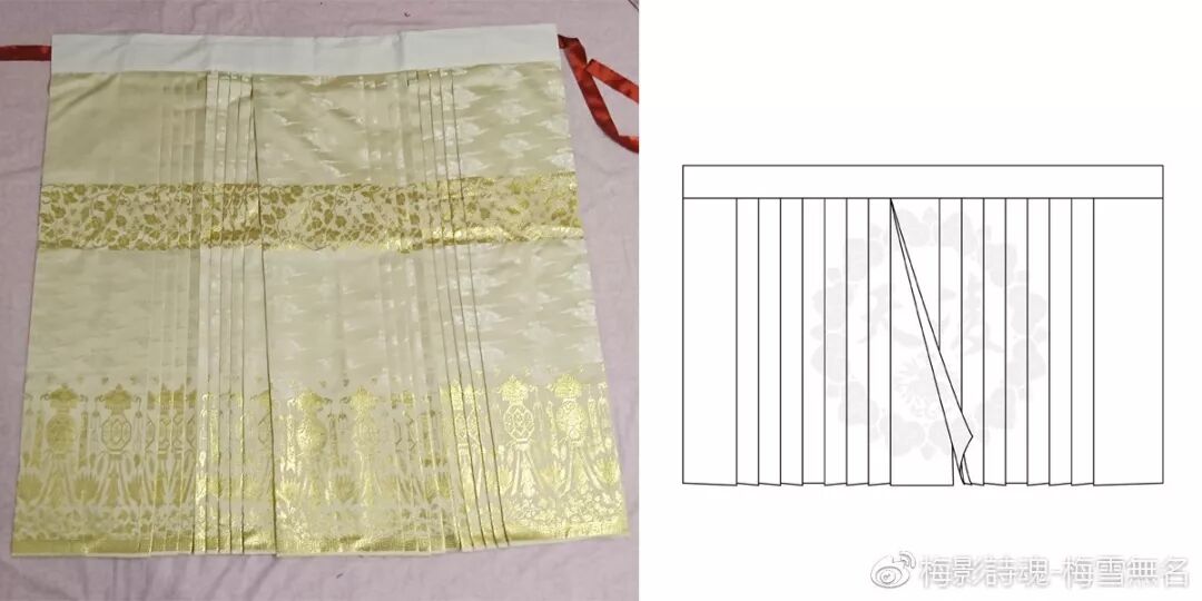 采用梯形褶的原因是,裙門寬了以后平行褶只能集中在兩側,無法蓬開,所以要用梯形褶。如果是窄裙門,褶子區夠大,用平行褶自然可以處理。(上述文作者:@梅影詩魂-梅雪無名