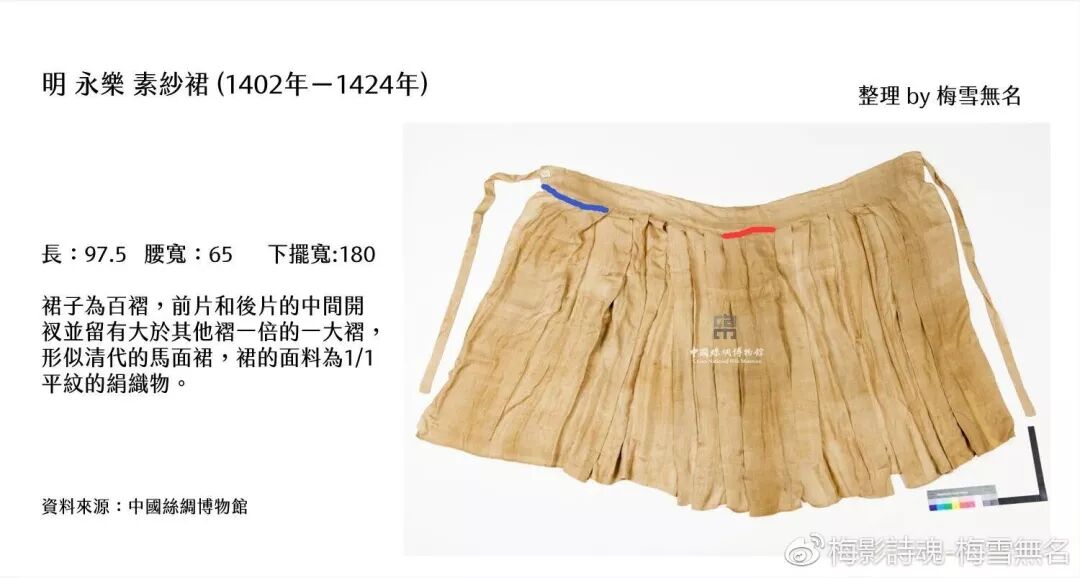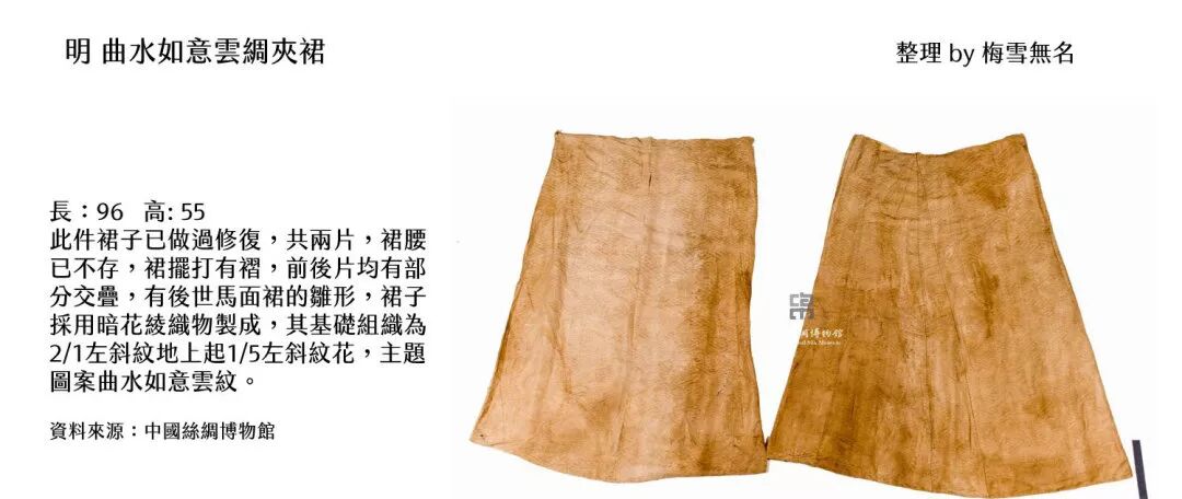 從明代出土的一些文物,也可以看到從兩大片布拼接,到腰側有打褶的發展痕跡。