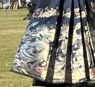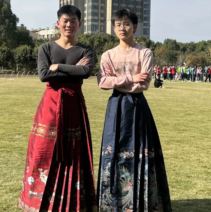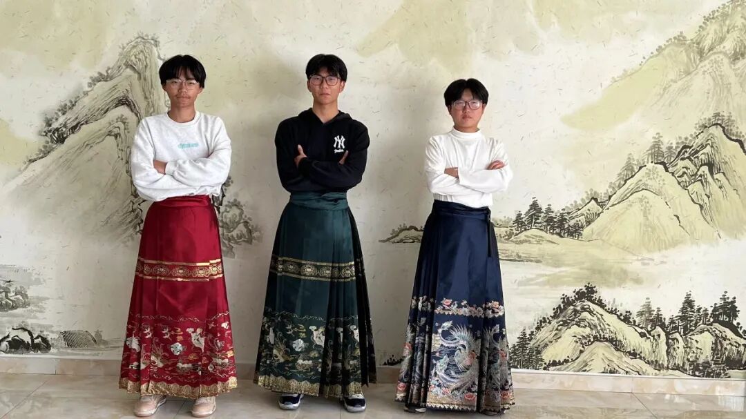 班上的男生卻說:這是女生穿的。(其實不然,馬面裙在明代就已經是男女都穿的服飾啦)所以,班上的男生就被攛掇得穿上了,颯爽英姿,玉樹臨風啊!