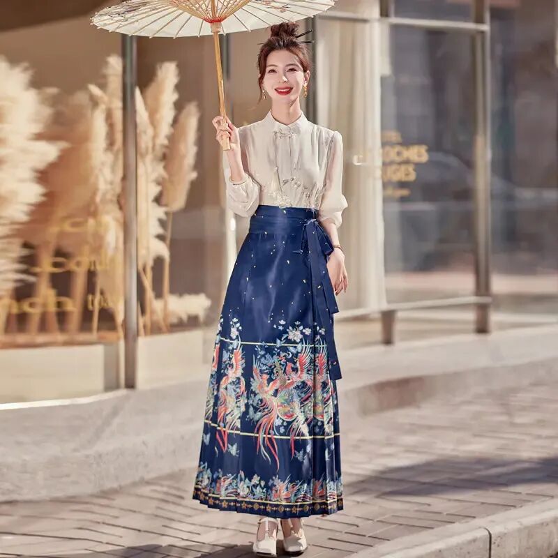 優雅氣質,春款長款國風印花百褶拼接馬面裙高腰修身半身裙MYX-JY-6761-L