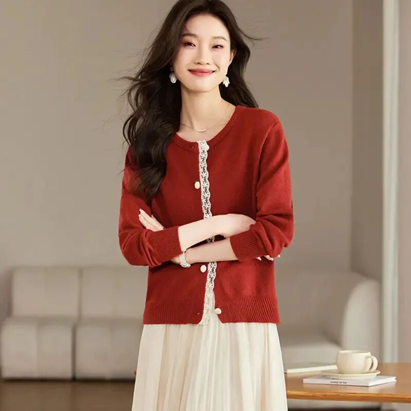 早春新款蕾絲邊毛衣外套,溫柔風別致好看針織開衫CC-J-468