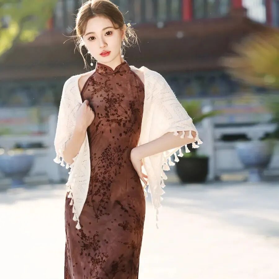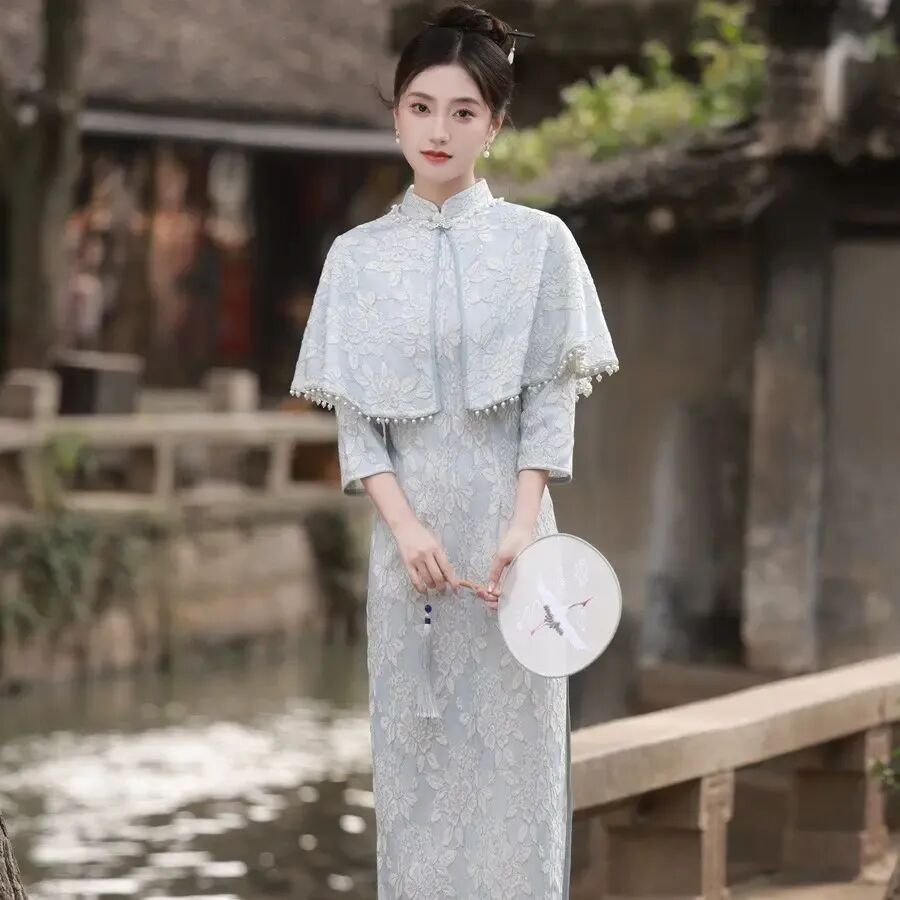 秋冬款蕾絲披肩小個子年輕款,高端氣質旗袍兩件套帶披肩YG-2294