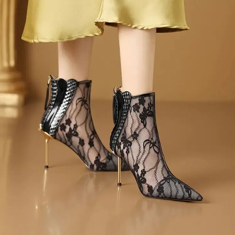 【預售5天】春秋靴高跟網靴,輕熟風氣質細跟尖頭蕾絲鏤空網紗靴蛇皮短筒靴SJS&2301-988