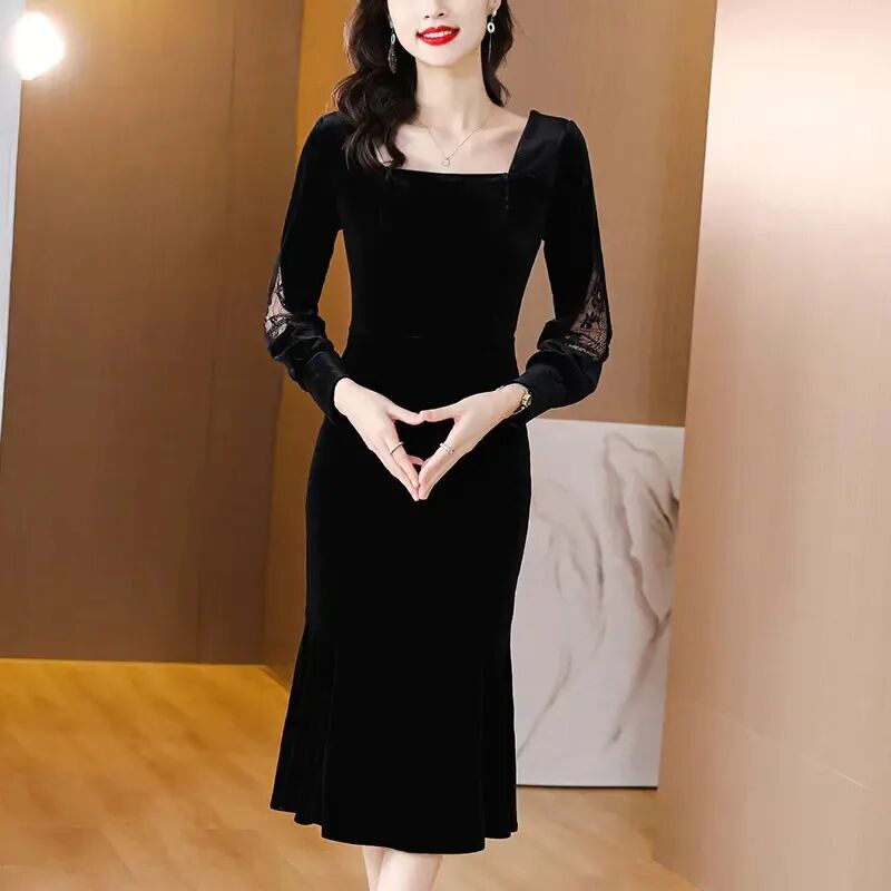 法式方領黑色金絲絨連衣裙,優雅蕾絲拼接包臀裙AHM-hmnz6092