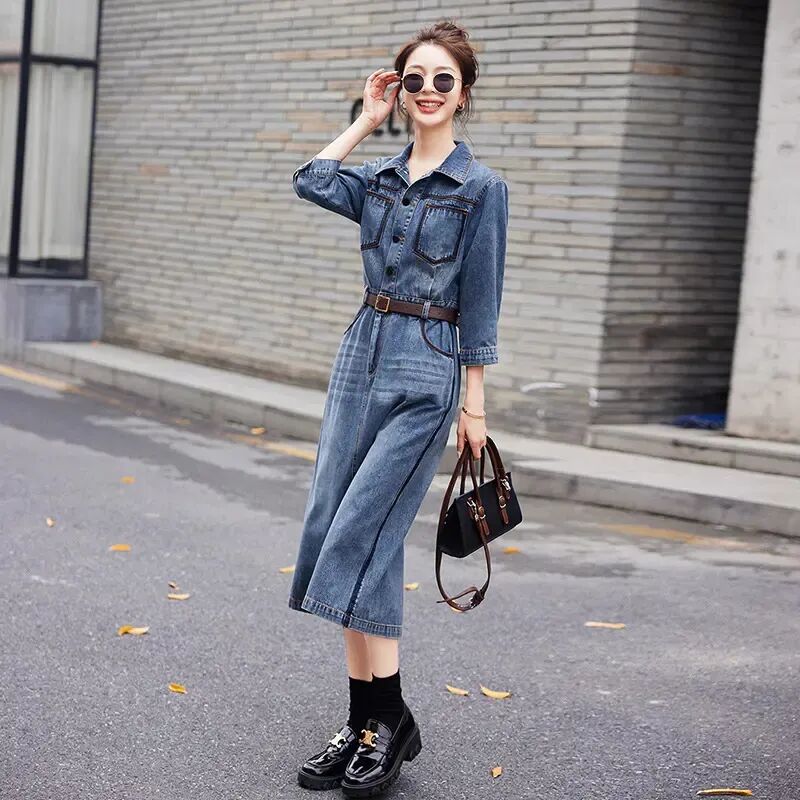 牛仔連衣裙氣質翻領簡約時尚單排扣中長裙HR-WQ92389