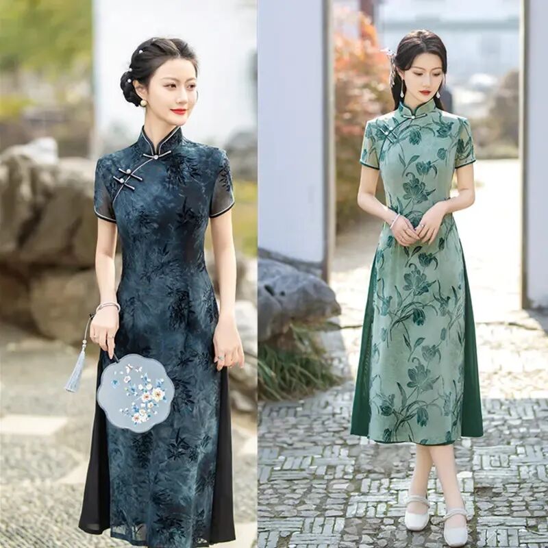 越南改良長款奧黛旗袍2024春夏新款植絨提花矮個子日常奧黛GX786188