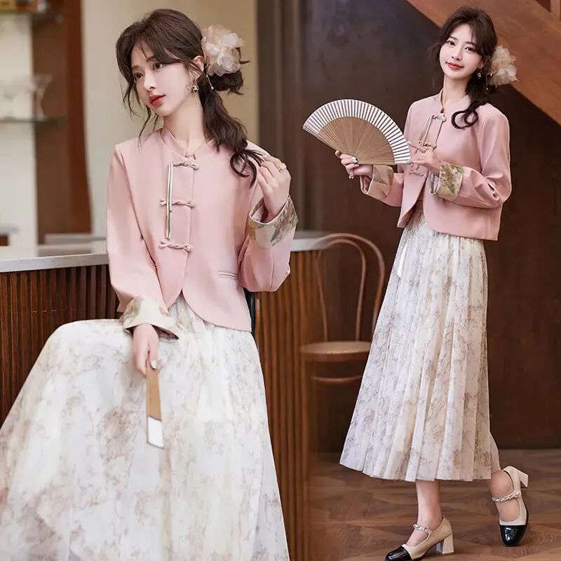 春季中式文藝套裙,袖口鑲色門襟盤扣小外套+壓縐花色半身裙HR-BLKE9902-1
