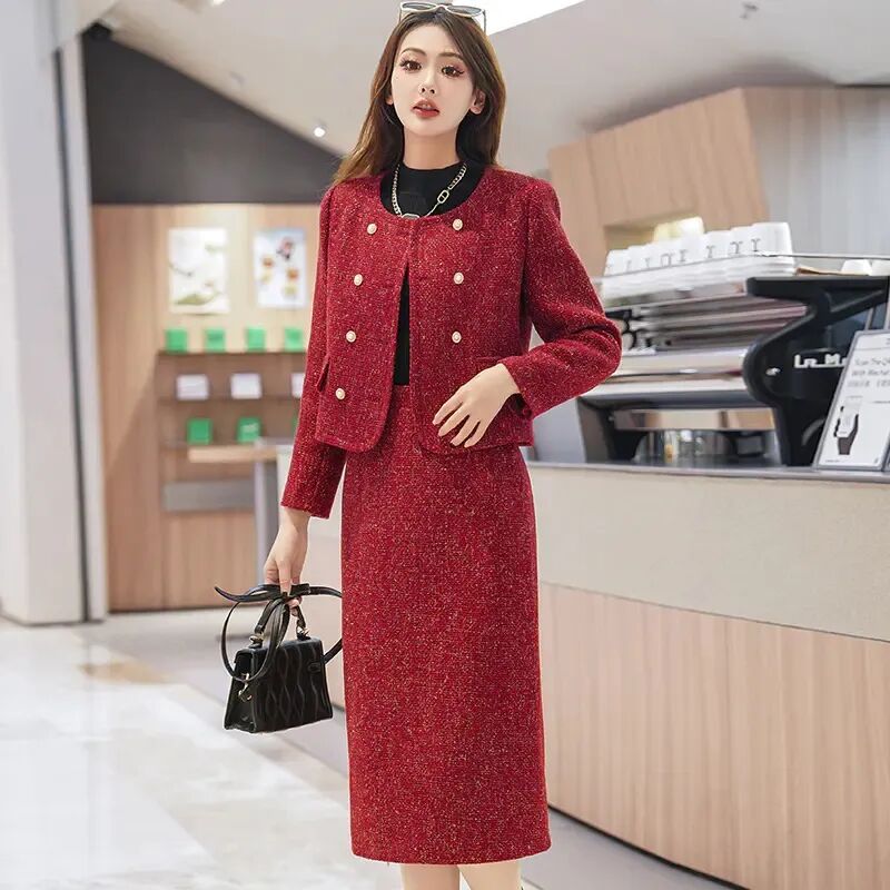 春款長袖小香風洋氣短款外套中長款時尚包臀裙通勤兩件套裙QYM-XYKL-4823-L