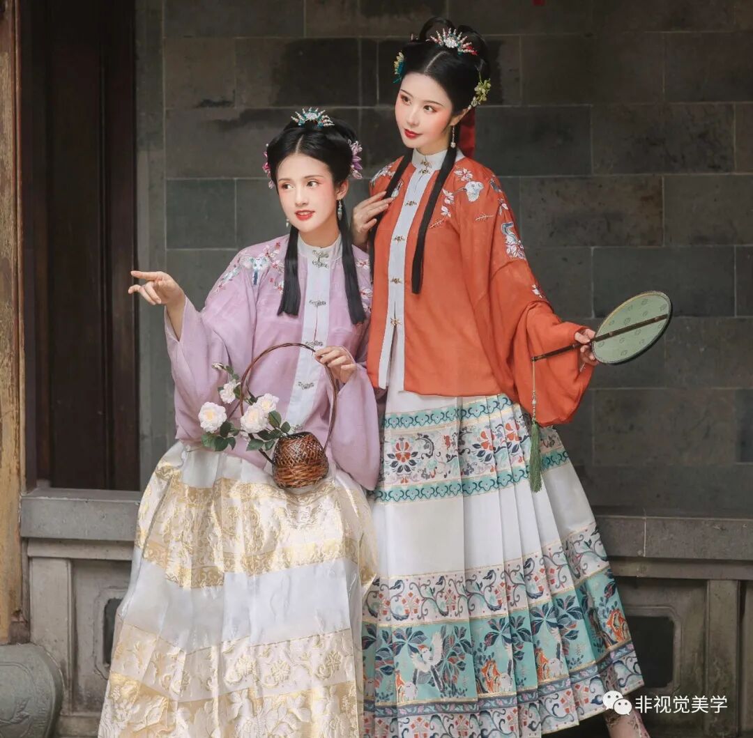圖為:兩個(gè)模特穿著刺繡印花短襖和妝花織金馬面裙,一個(gè)拿著團(tuán)扇,一個(gè)提著花籃