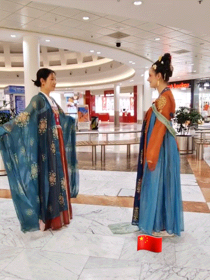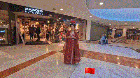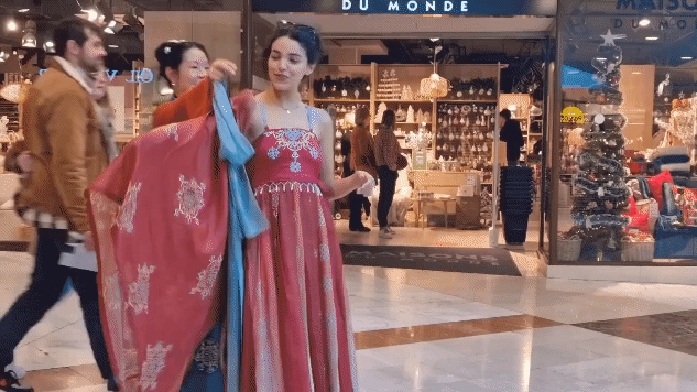 于是近幾個(gè)月來,歐洲街頭出現(xiàn)這樣一個(gè)中國姑娘,她拖著個(gè)行李箱,身旁擺放著一張介紹漢服的展示板,擺起小攤出現(xiàn)在鬧市和商場(chǎng)里。