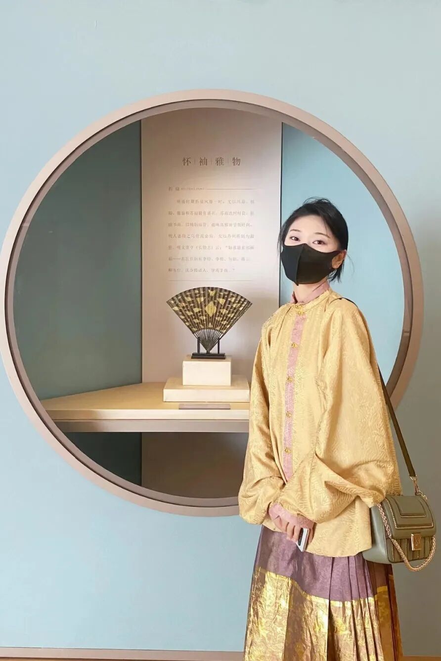 博主@涵淡-小月亮曾身著泥金豎領(lǐng)襖與馬面裙去參觀蘇州博物館,逛到扇區(qū)時(shí)她恰好碰上了講解員在解說一把烏骨泥金扇。同一種中國色在此相遇,她被講解員在聚集聆聽的人群中發(fā)現(xiàn),順勢(shì)熱情地向大家展示了身上的服裝,并在社交平臺(tái)記錄下那時(shí)的心情:偶爾出去逛博物館,看到展柜內(nèi)外的古今文化相連,這也是歷史美學(xué)傳承的另一種魅力吧。
