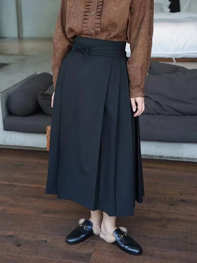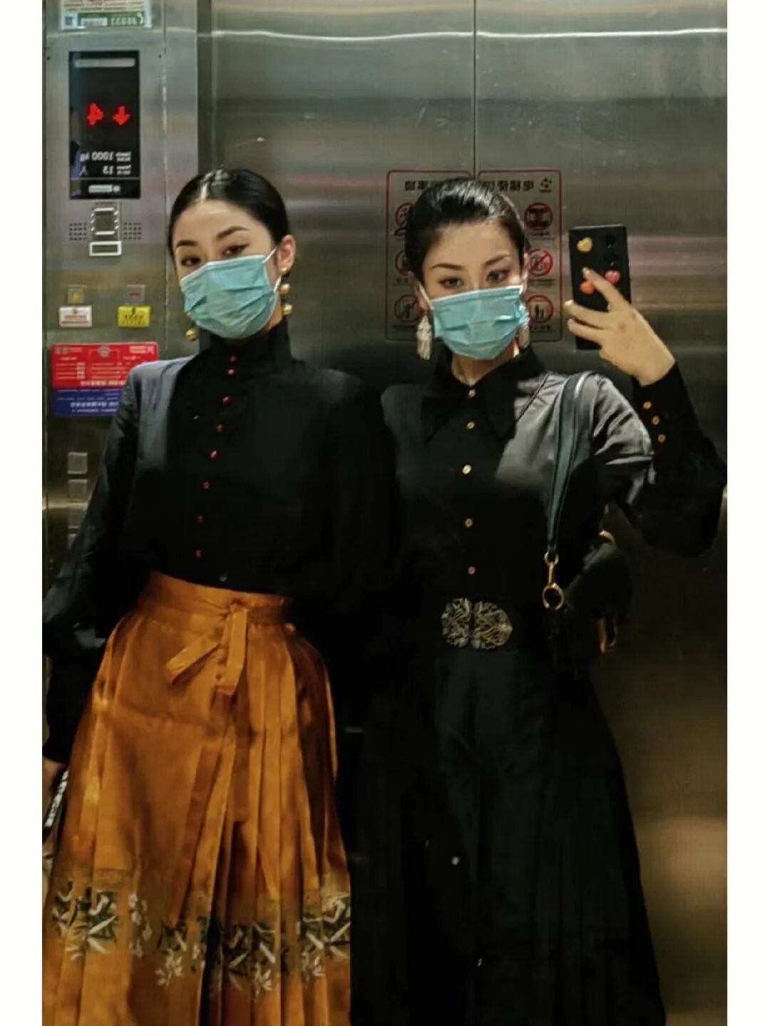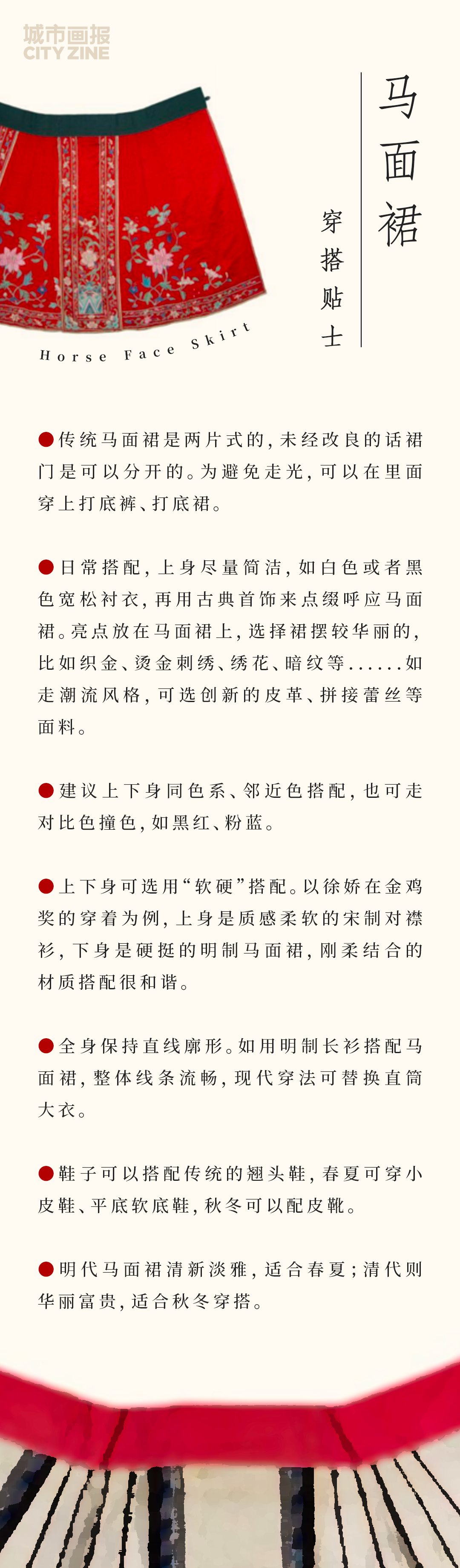 傳統(tǒng)馬面裙的穿法,是裙門對(duì)準(zhǔn)身體正中間,褶皺在兩側(cè);系帶交叉,繞至身體正前方,穿著過程比較復(fù)雜。如何讓馬面裙更日常?這里城畫君根據(jù)受訪者們的建議,整理了一份「馬面裙穿搭小技巧」