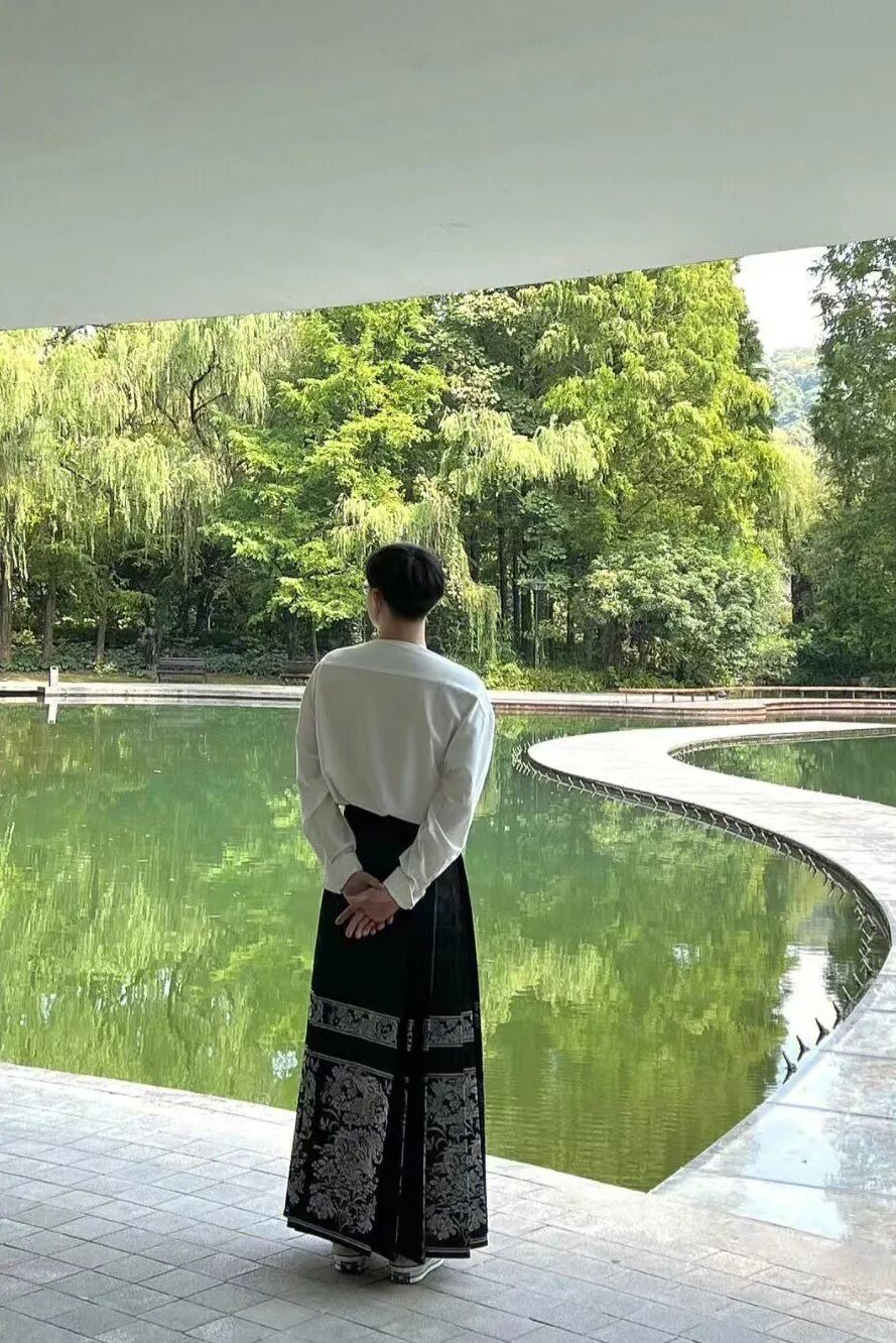 而且馬面裙寬闊而硬朗的廓形、線條,也能運(yùn)用到無性別穿搭上。其實(shí)它在宋代誕生時(shí),就是男女都可穿的款式,因此現(xiàn)代不少男性穿起馬面裙也毫無違和感,頗有一種溫文爾雅的氣質(zhì)。