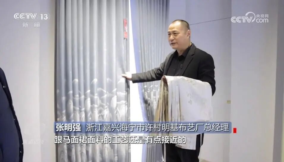 浙江嘉興海寧市許村明基布藝廠總經理張明強:提花其實比較接近,跟馬面裙面料的工藝有點接近,但是馬面裙的密度會超過它很多。