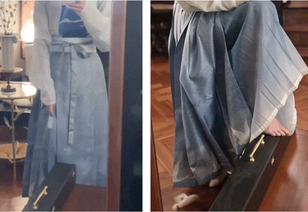 其二,是馬面裙穿法是圍裹式,全靠系帶固定,系不好就很容易往下退;還有,裙型并不顯瘦!如果身材中段比較胖的話,可以搭長(zhǎng)衫遮住腰頭。