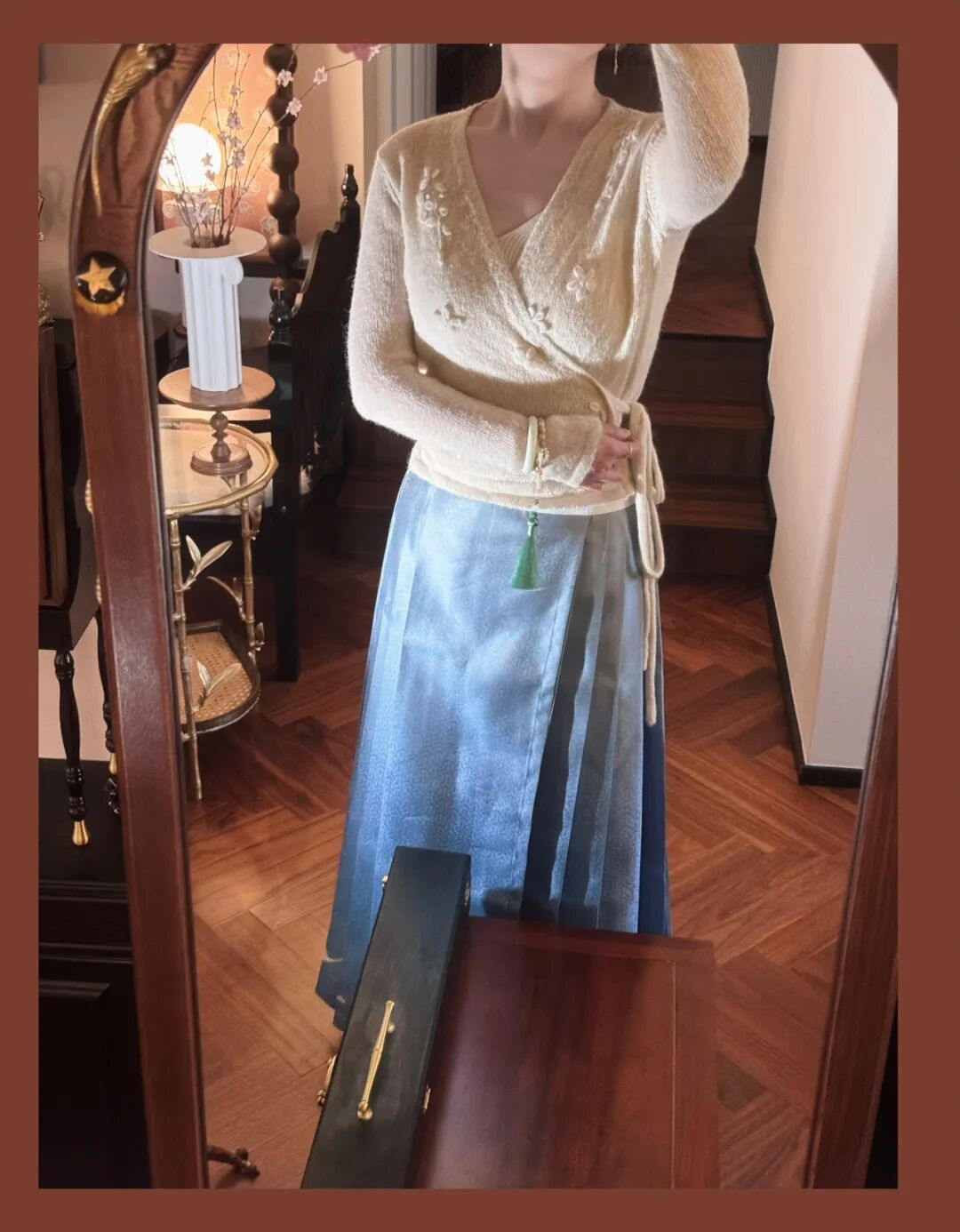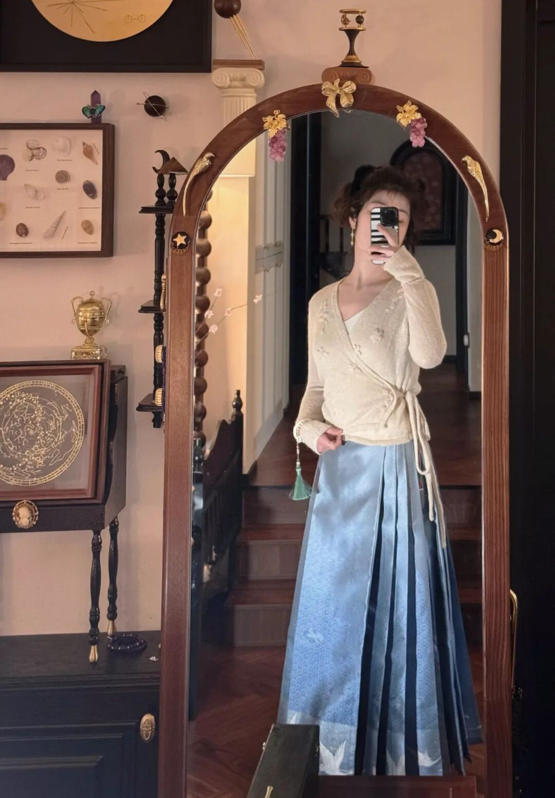 芭蕾練功針織衫,和馬面裙真的超級(jí)適配!柔軟貼身的斜襟系帶針織衫,讓直而硬朗的馬面裙看起來溫柔了!