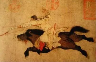 遼代的缺胯袍開衩后左右各有兩片梯形小片,頂端縫住,以使開衩后仍能起到遮掩作用。《獲鹿圖》描繪了開衩袍在馬背上的使用情景。