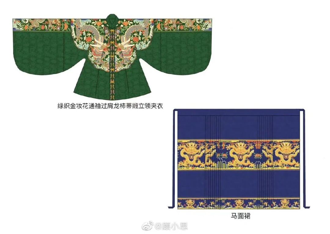 因?yàn)槊鞔梗R面裙占了絕大多數(shù),因此不需要刻意描述形制。到了服飾史中,為了區(qū)別這種有馬面構(gòu)造的裙子,而將之稱為馬面裙。