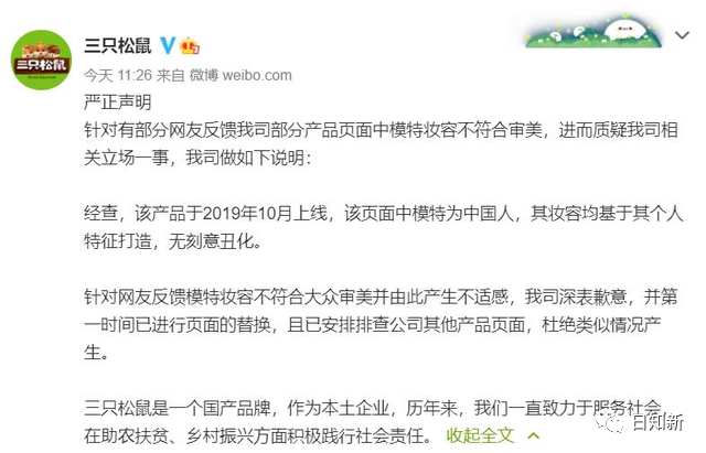 三只松鼠26日針對(duì)網(wǎng)友質(zhì)疑產(chǎn)品模特妝容一事發(fā)聲明致歉,稱該產(chǎn)品于2019年10月上線,頁面中模特為中國人,妝容基于其個(gè)人特征打造,無刻意丑化,為避免產(chǎn)生不適感,已進(jìn)行頁面的替換。