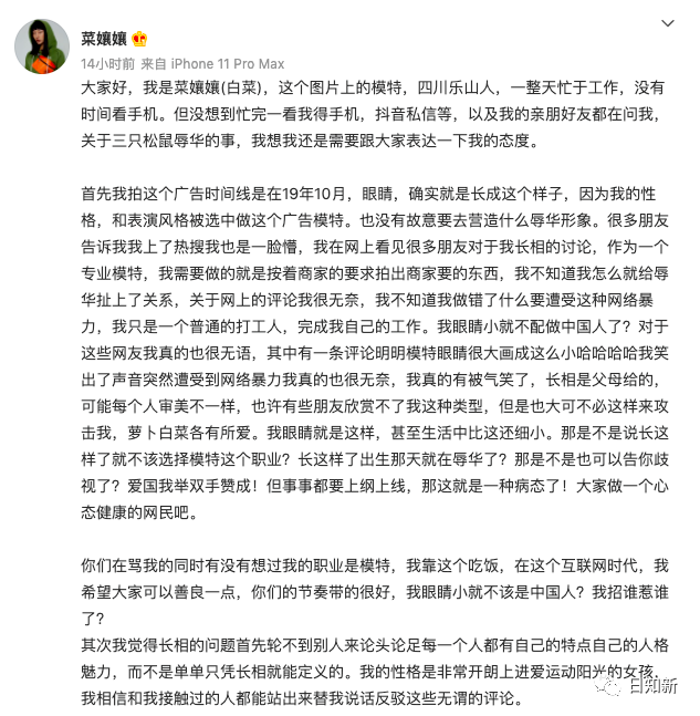 三只松鼠模特菜孃孃:我眼睛小就不配做中國人了?