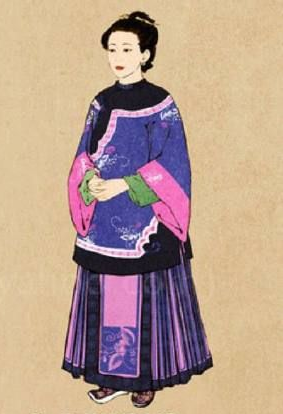 晚清時(shí)期漢族女子上衣著襖或衫,下裳著馬面裙,裙內(nèi)著褲。上衣下擺較長(zhǎng),可將馬面裙上部遮住,褲腳長(zhǎng)于裙擺,可露出褲腳刺繡花邊。因而馬面裙上部會(huì)出現(xiàn)留白。