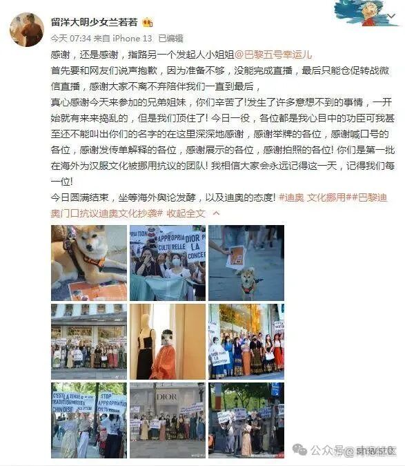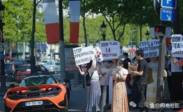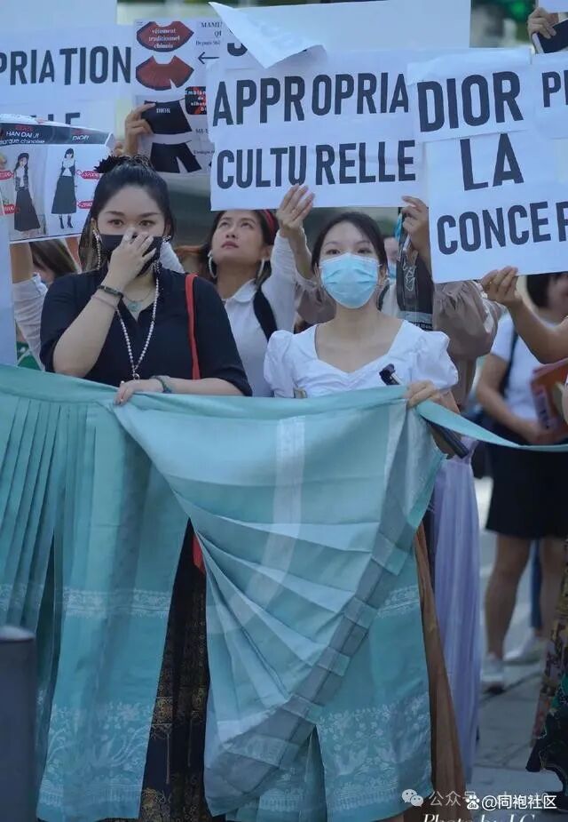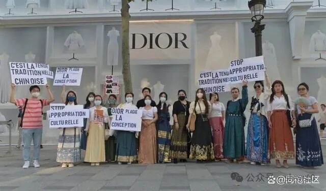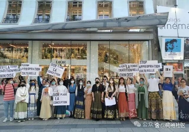 2022年7月23日,部分中國留學生在巴黎迪奧旗艦店附近,手持標語抗議近期迪奧對中國傳統服飾馬面裙的抄襲!請尊重我們的文化停止文化挪用,他們喊著響亮的口號,發出對迪奧公司的不滿!同時,大家也對圍觀群眾進行了科普。據博主:法蘭西那點事兒,本次活動由在法留學生留洋大明少女蘭若若和巴黎五號幸運兒發起。