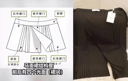 然而愛好漢服文化的中國網友對比資料后卻陡然發現,這條售價高達2.9萬的所謂廓形裙子。不止在靜態圖片中與馬面裙廓形相似,就連在動態視頻中,兩片共腰、裙門交疊以及前后開叉的結構都明顯是馬面裙所具有的特征。