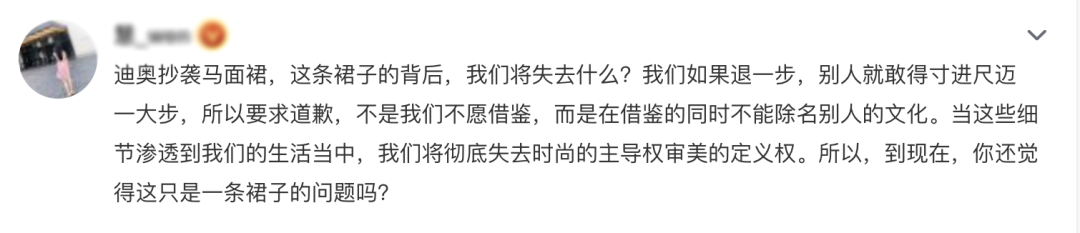 對此,中國日報也點評,迪奧抄襲中國傳統服飾馬面裙風波發酵兩周多后,迪奧始終保持緘默。迪奧對于中國文化和中國市場沒有絲毫的尊重。中國文化從來都是開放包容的,如果迪奧在這條裙子的簡介上注明靈感來自中國馬面裙或者坦誠一點,直接說這是馬面裙,中國網友還會這么憤怒嘛?相反,我們還會為中國的服飾文化走向世界而感到欣喜。