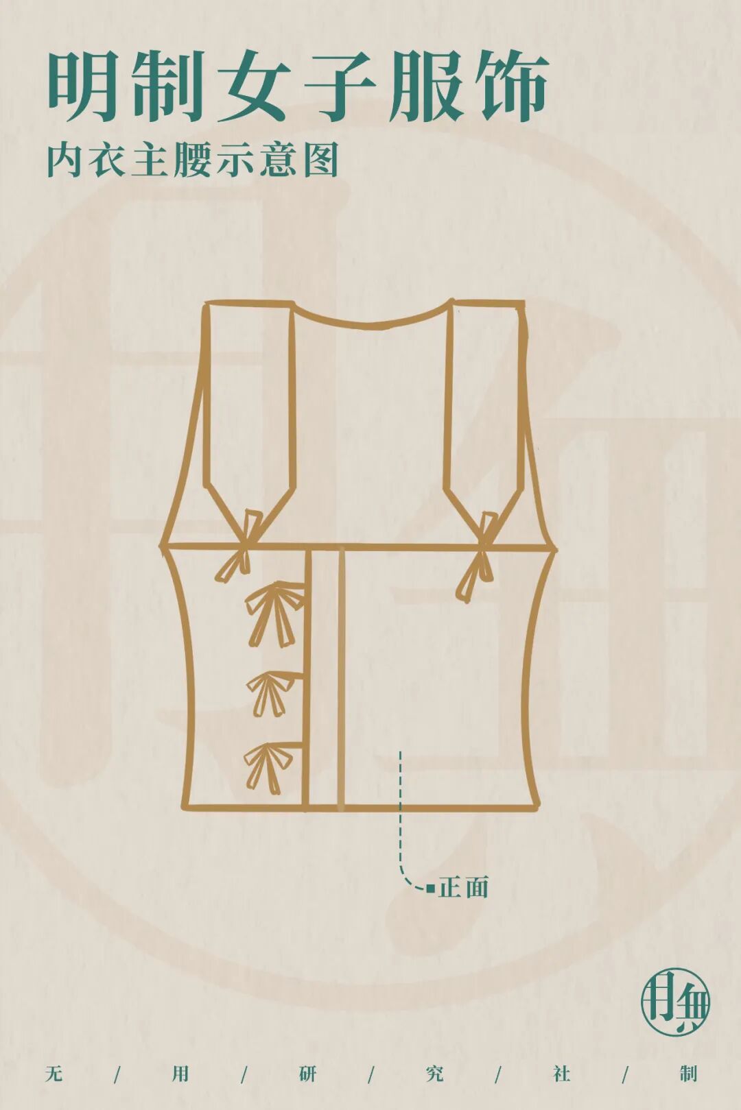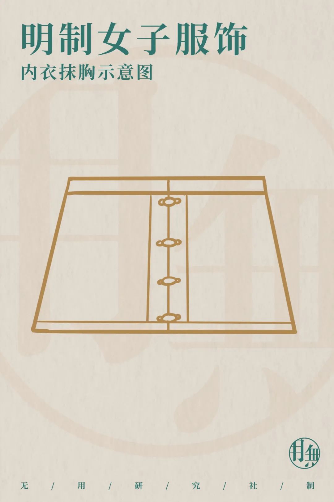 內衣:內衣在明代被稱為主腰、抹胸,其材質主要為紗、綾、羅等織物。明代主腰最常見的形制一種是制成與胸圍相等、長至腰腹的橫幅,然后圍在胸部,開口向前或者向后,綴有一排鈕扣或者系帶作為固定之用。