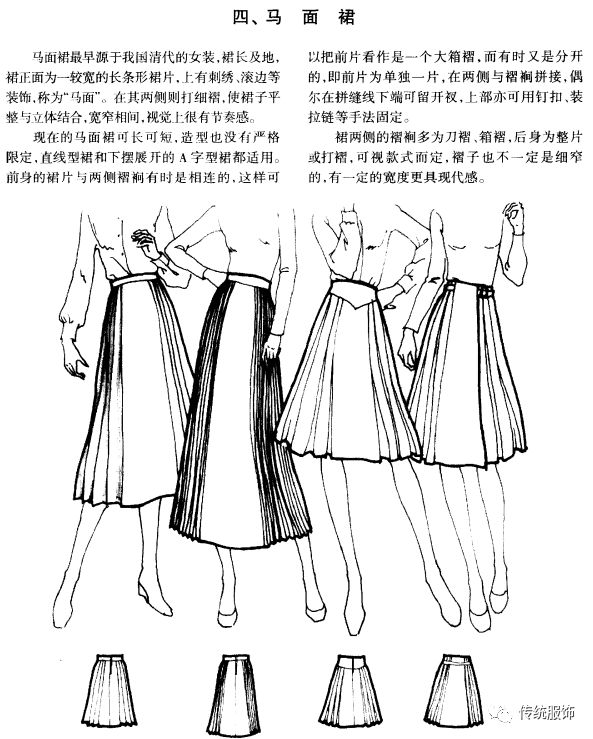 【馬面裙】 裙類名稱,是中國傳統名稱,裙子兩側是折裥,中間有一段光面,俗稱馬面。有的還在馬面中綴以刺繡裝飾,按照西式裙類的名稱,這種式樣造型的女裙,稱間隔裥裙。