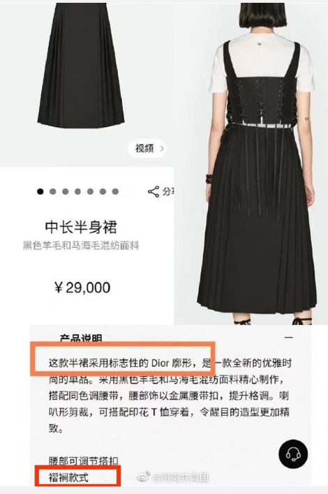事情是這樣的:有漢服愛好者發現,迪奧新上市的一件標價2.9萬元的裙子,與中國傳統服飾馬面裙的設計非常相似。