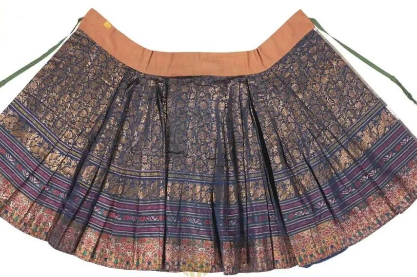 將馬面裙兩側的裙幅打褶后所形成的樣式。是明清馬面裙共同的特點。清代馬面裙的褶裥更加細而密, 兩側對稱,排列整齊有序,褶裥細密的程度少則幾十個,多者成百或多可達一百六十個,俗稱百褶裙。是當時十分流行的裙式。