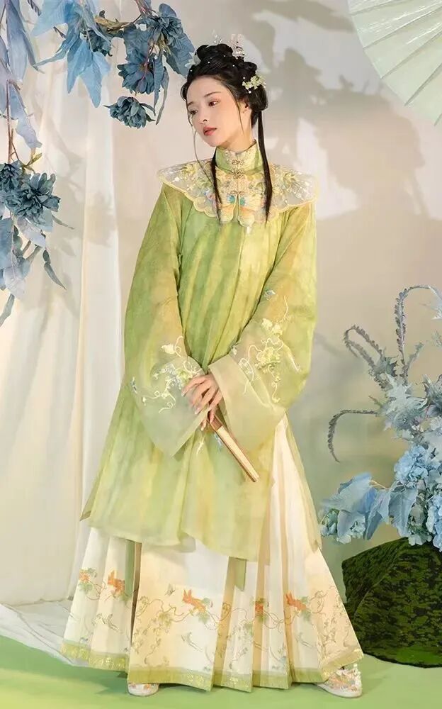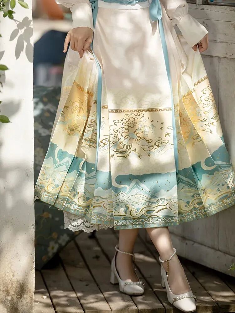 馬面裙在明盛行,但此時文獻中并無記載馬面裙之名,此時期裙式簡單且未定型,色彩秀麗,主體風格為清新淡雅。
