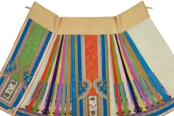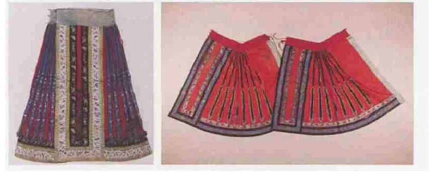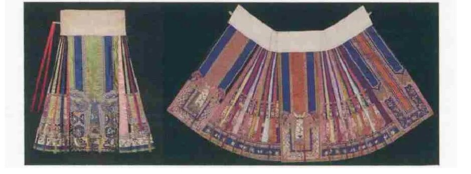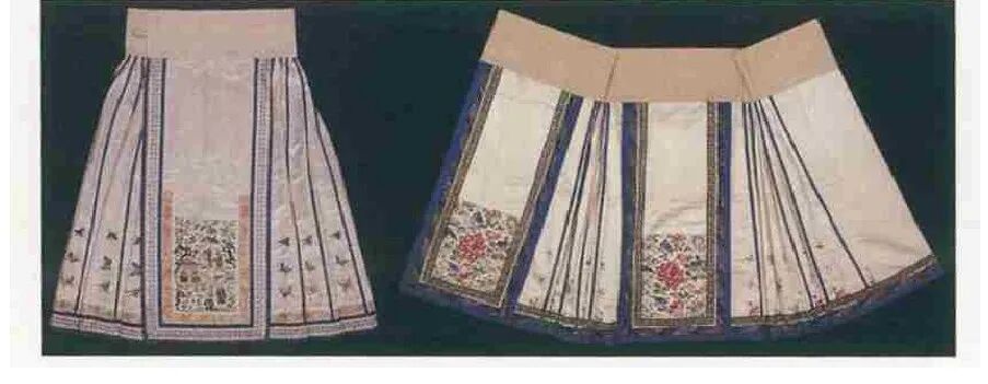 清代之裙,馬面裙是其典型,另有百褶裙、魚鱗裙和鳳尾裙等名目。所謂馬面是指裙前后兩個長方形的外裙門,馬面裙側面打裥,裙腰多用白色布,取白頭偕老之意,以繩或紐固結。