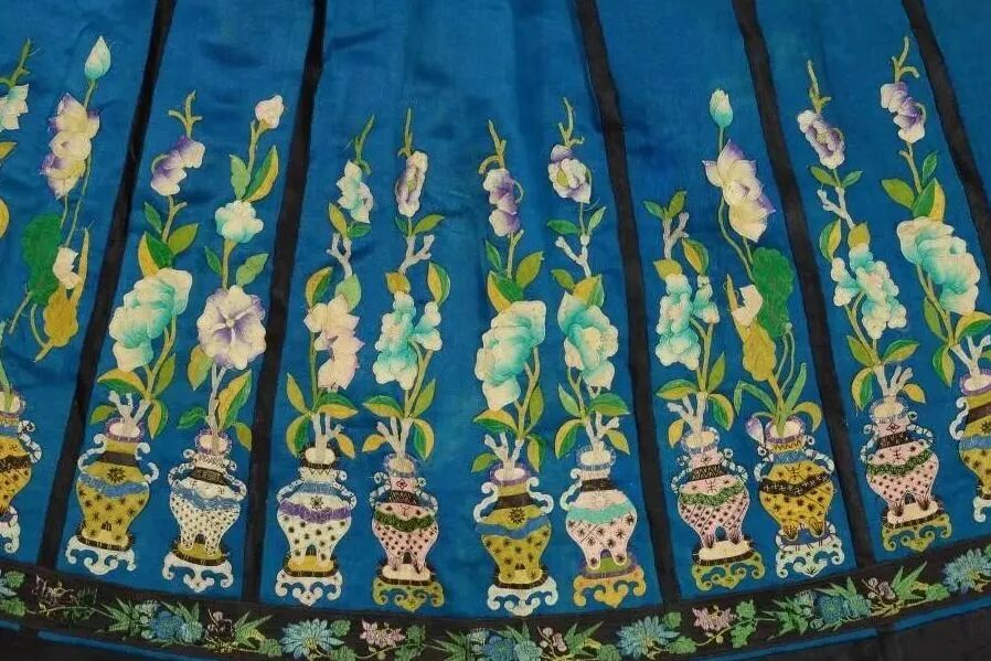 百折裙前后正中間,留有兩塊長條不打折,上面繡花飾紋樣,稱馬面裙。紗質的馬面裙,可和襖、褂、帔等配用。花色品種較多,貧富皆飾,也可作扎靠的襯裙,或和旦角小衣包配套。