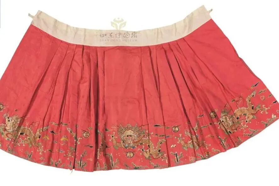 明 紅色暗花緞繡云蟒裙 山東博物館藏
