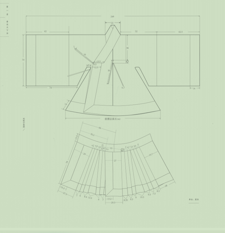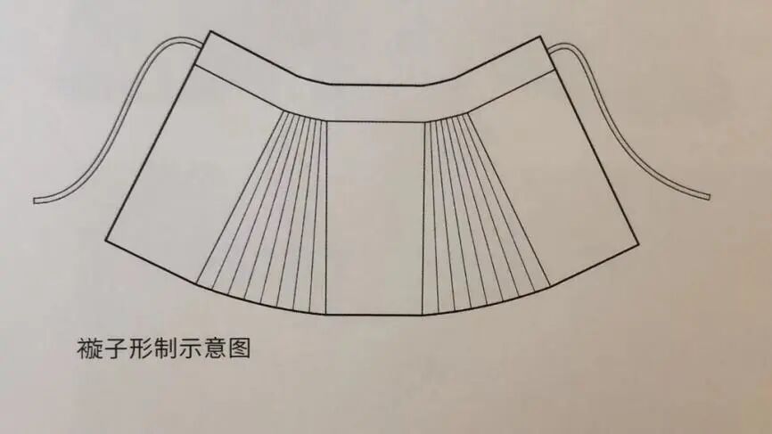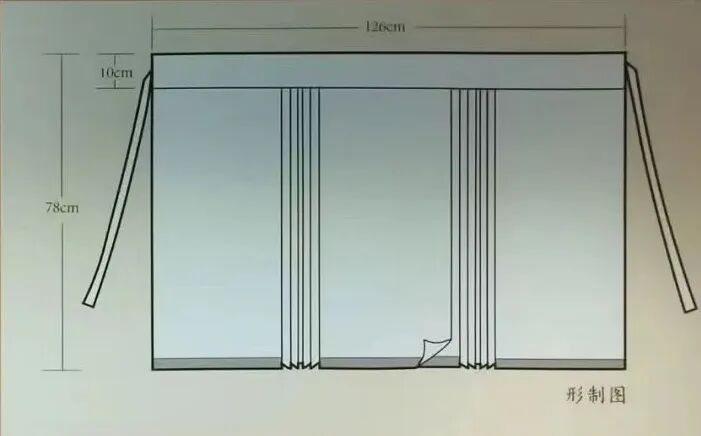 比如褶裥的制作,華夏講究以折代剪,講究自然,不會刻意地剪掉褶裥多余部分,并不是西式省道的做法。而且最關鍵的是,馬面褶裙自然要褶裥,是布幅打褶打出來的褶裥,而不是像闌干裙這樣,裁好裙片后,拼接出來的梯形效果。