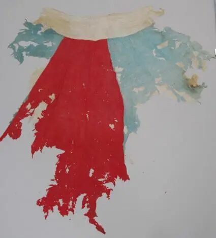距今約1800年魏晉花海畢家灘墓葬出土的緋碧裙,其結構是多幅拼接的幅裙,一片式圍合,并且打褶。跟先秦和兩漢的裙子相比,也沒有本質上的差異,就是拼接的色彩不同,也就是間色裙。