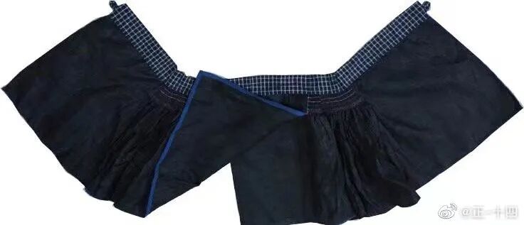 但是這條裙子就是幾塊方布拼接在一起,然后每一幅布都打褶,褶裥也不是馬面褶,更重要的是并沒有兩兩重疊的裙門呀。說到底也就是一條很普通的褶裙,基本結構特征都不具備,怎么能說成是馬面裙的起源呢?