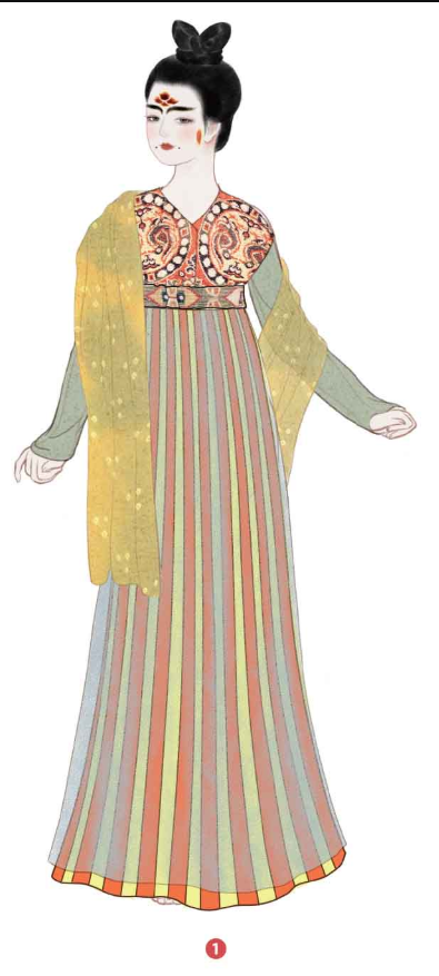 我們再來看距今1000多年的唐代間色裙,其結構是多幅拼接的幅裙,一片式圍合。跟漢魏裙子相比,也沒有本質上的差異。
