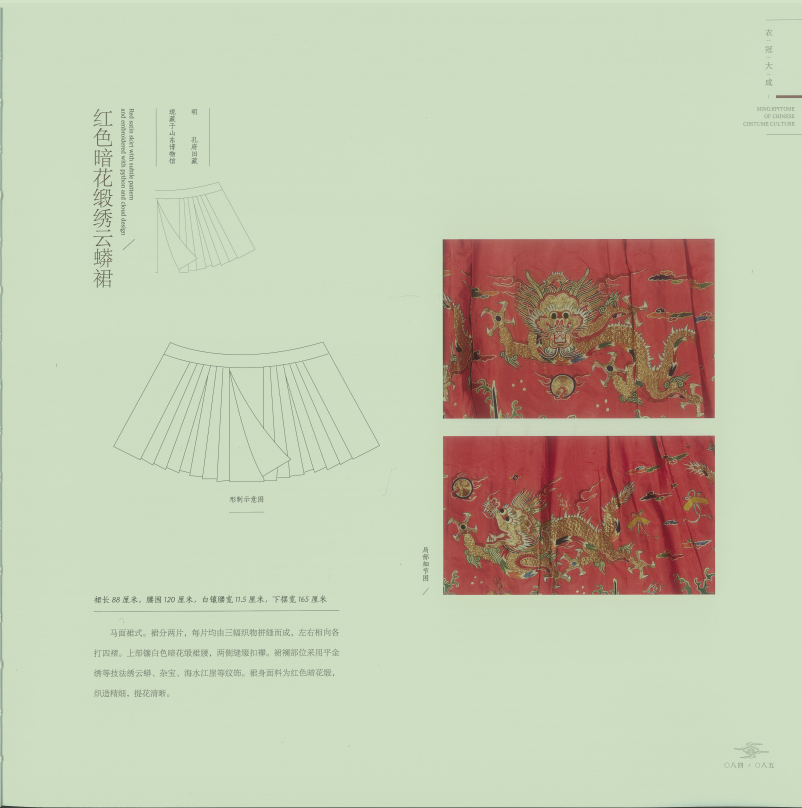 宋末一直到元末,具備全部結構特征的馬面裙已經出現,已經成型。到了明代,這種結構特征的馬面裙繼續發展,不僅是類型更加精細、完整,面料和做工也更加精美、豐富??梢哉f,明代是馬面裙定型時期。