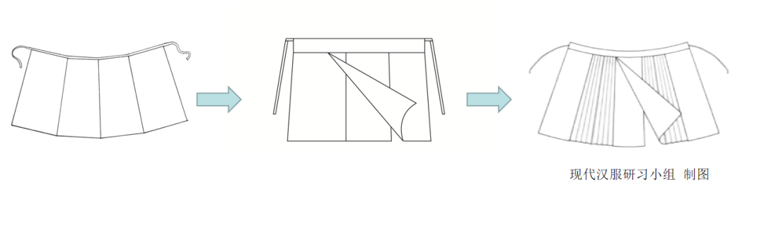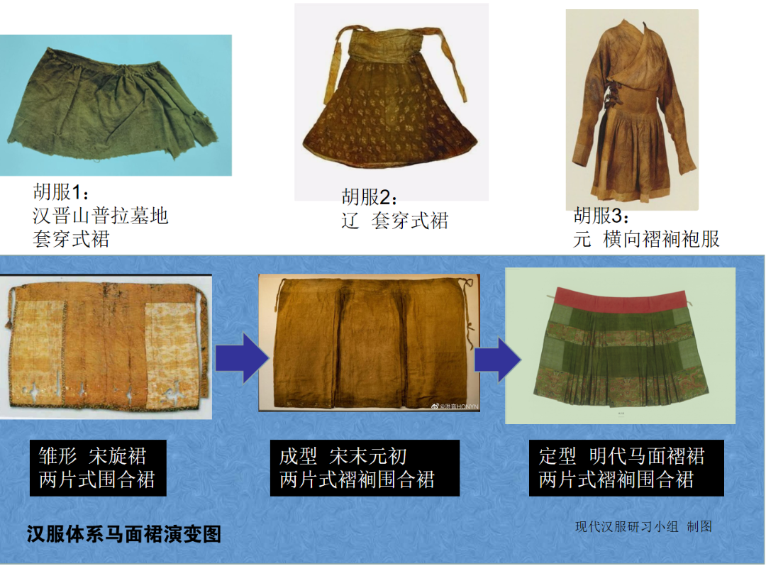 第二階段的兩片式可以看作是第一階段兩條一片式裙子部分重疊縫合,第三階段的馬面褶裙可以看作是第二階段兩片式加褶裥。發展演變的脈絡和邏輯是非常順暢的,與各類胡服裙子相比,區別也是非常明顯的。