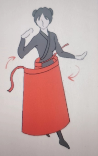 圍合式是指一條裙腰連接裙身所有裙幅,穿著時交疊圍合,系帶固定。