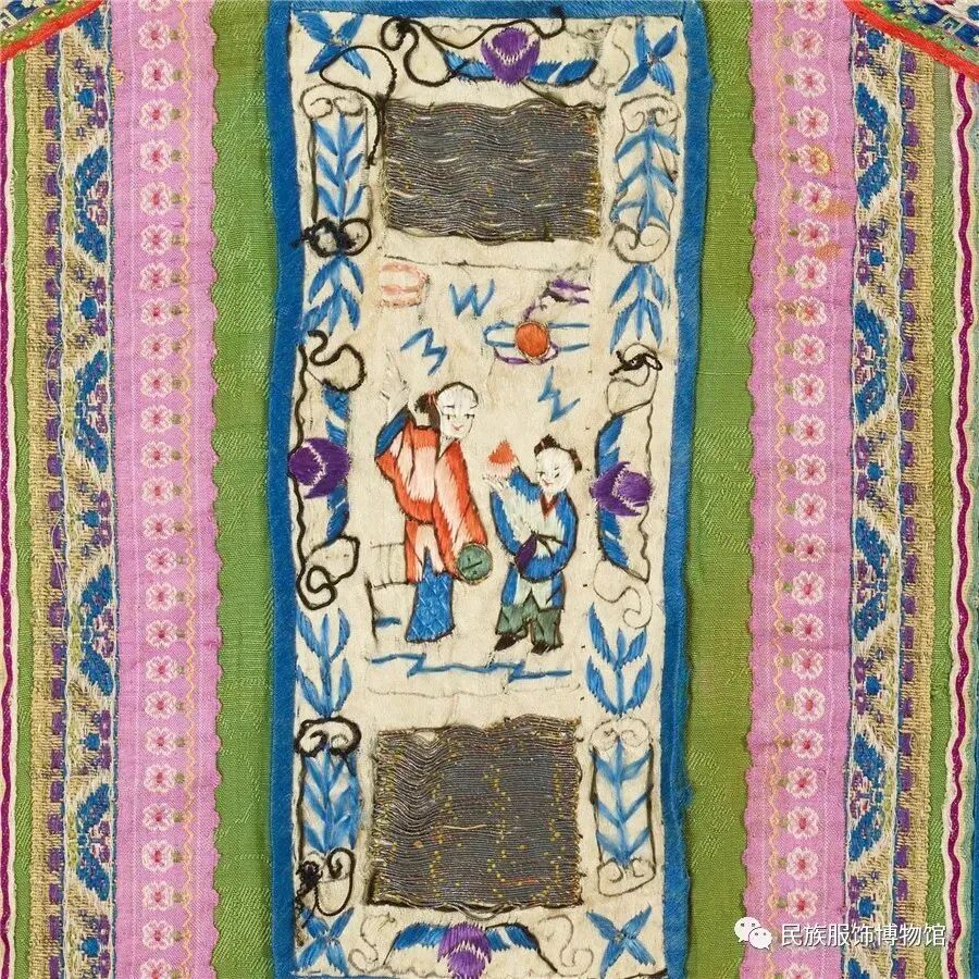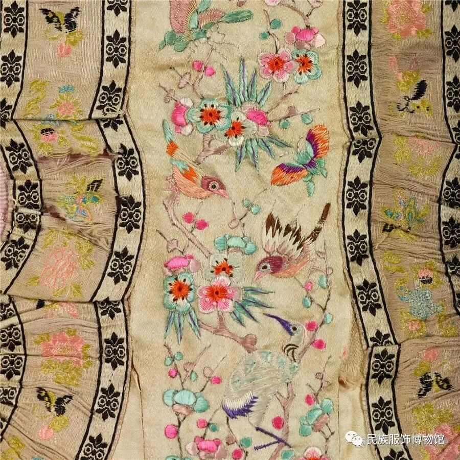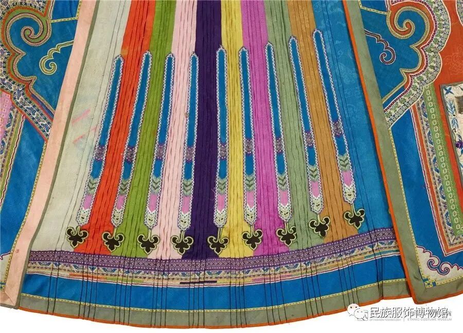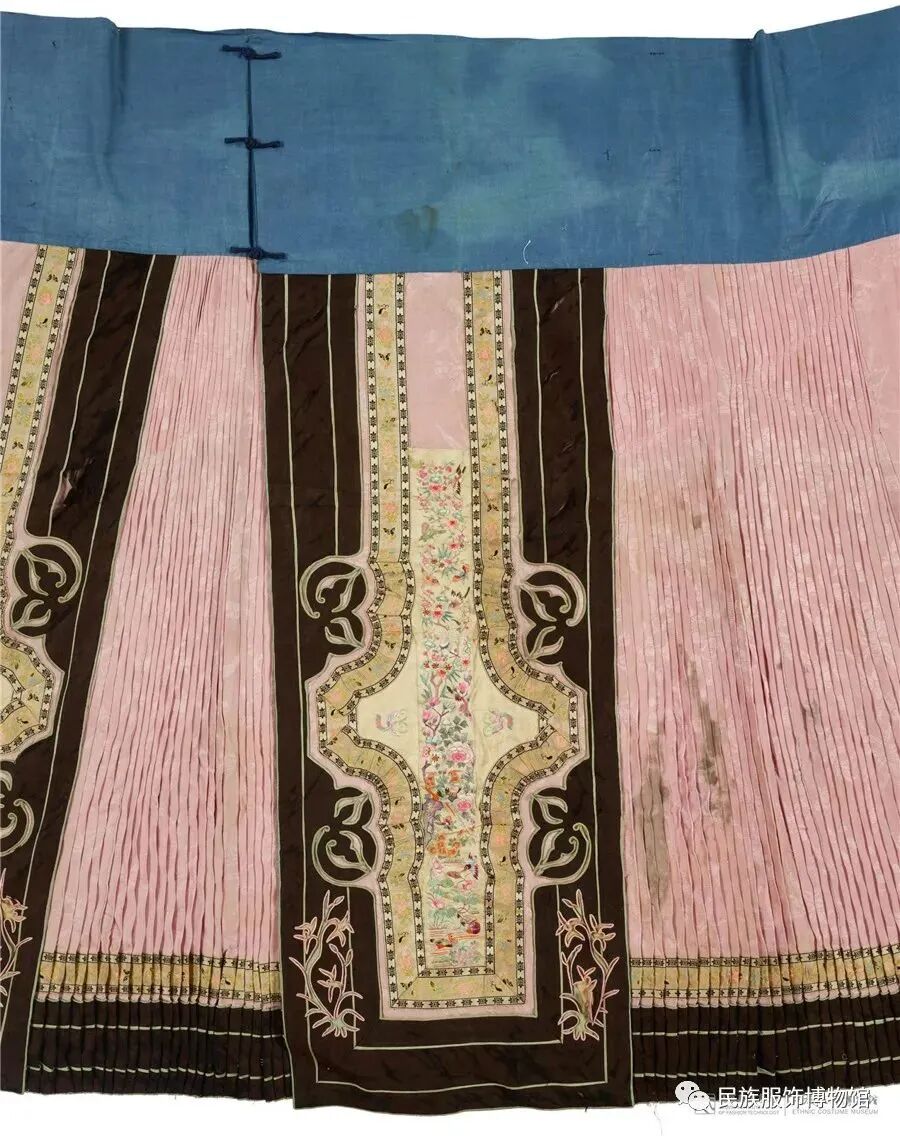 中國許多博物館里都有馬面裙的藏品,其中「民族服飾博物館」的云觀展里的粉色提花綢飾粵繡挖云鑲邊魚鱗褶馬面裙、五彩提花綢繡人物紋魚鱗褶月華馬面裙十分美麗且具有代表性。讓我們先欣賞一下。